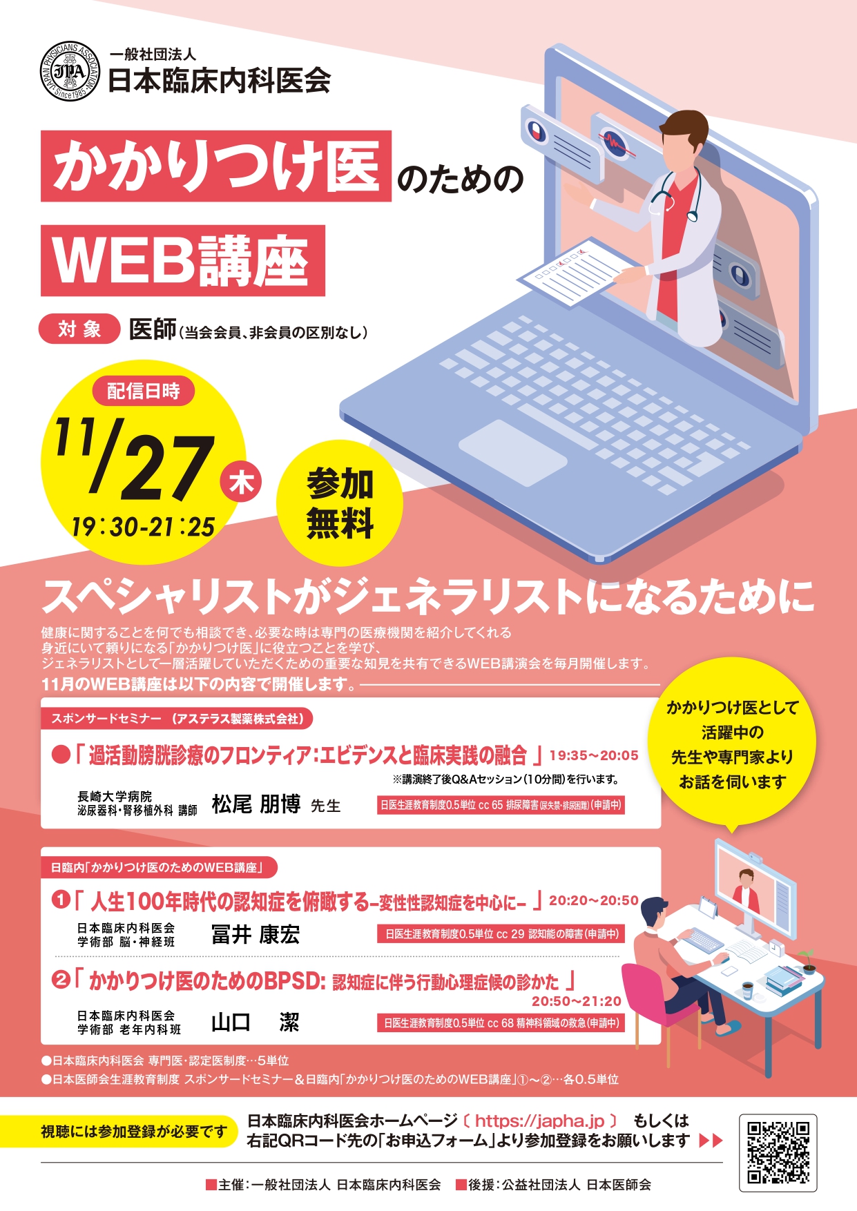 日本臨床内科医会「かかりつけ医のためのWEB講座(11月)」 開催日: 2025.11.27(木)19:30 場所:Web配信 申込可能 Web研修 掲載日:2025.09.22 最終更新日:2025.09.22 詳細は以下パンフレットをご参照ください。 研修申込はこちら 一覧に戻る